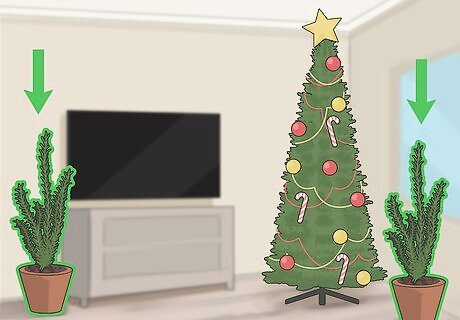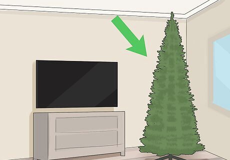 Place the tree in a prominent spot or window. Try putting it near the front window or to the side of the television. Set it up where you'll be able to admire it often. You may need to rearrange a bit to fit your Christmas tree in the living room. Keep live trees away from heaters or fireplaces, as they can catch fire. When putting up a a live Christmas tree, cut off the very bottom when you get home before you stick it in water. Put it in the stand and ensure it has plenty of water at all times. Follow the instructions for your artificial tree. With some, you'll need to put up the trunk then insert individual branches. Fluff them out as you go. With others, it will come in several main sections that you attach at the trunk.
