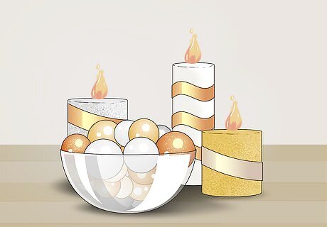 Make the room sparkle with metallics and candles. The sparkle of metallic ornaments and the bright flames of candles add warmth to the room. Place silver and gold ornaments in a bowl, for instance, and surround them with candles in a variety of sizes. Hang glittery snowflakes in the windows or along the mantelpiece. These little touches will add brightness and joy to the space.