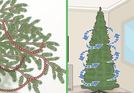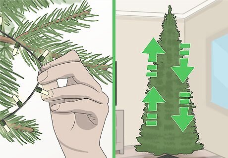 Add lights moving from the bottom to the top. Twine the lights around each of the main branches, going up and down the tree instead of around. As you wrap the lights, make sure you are getting them up close to the trunk, as illumination from within gives the best effect. Make sure to hit as much of the tree as you can as you move around it in vertical lines. Keep in mind that many artificial trees come pre-lit. Lights come in 2 main varieties, incandescent and LED lights. LEDs last longer and stay cooler, but the warmth of incandescent will help spread the pine tree scent around the room with a live tree. These 2 types come in many shapes and sizes, as well as colors, so pick whatever you like best. Just try to be consistent with what you pick. You'll probably need at least 2-4 strands for an average size tree. Opt for a wire color that matches your tree.