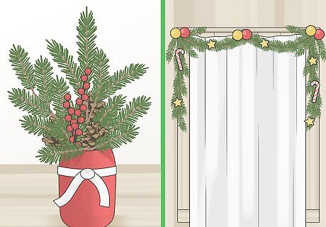 Scatter evergreens and pinecones around to bring freshness to the room. Even if you don't have a live tree, you can still get that wonderful scent. Purchase or gather some branches and place them in a vase or basket. Toss some pinecones in with the greenery, along with something red, such as apples or cranberries. If you want your branches to stay fresher for longer, cut off the ends and put them in water. Try adding an evergreen garland along the mantel or along the tops of curtain rods.