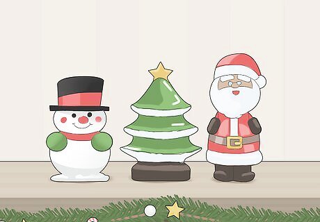 Scatter your favorite holiday figurines throughout the room. Picking one style can help create a cohesive look. For instance, collect Santa figurines and place them all over the room in small groups. However, you can also mix-and-match to your heart's content. Go for a variety, including different sizes. Group smaller ones together and then place a large one by the tree, for example. You could also try doves, snowflakes, nutcrackers, angels, reindeer, snowpeople, or anything else you fancy!