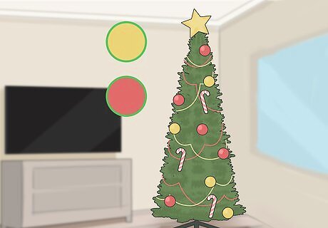 Choose a color theme or scheme for your ornaments. Try drawing on colors you already have in your room or just pick a color or two you love. You could also pick a theme, like "snow," "candy," or "plaid" to decorate your tree. Of course, your theme could also be "all my favorite ornaments!" A loving mixture of old and new ornaments, handmade and store-bought, can make a lovely tree. Start with the bigger ornaments. Put your favorites up first in places where they'll be seen the most. Try to hang the other large ornaments at even intervals around the tree, though you can leave the back sparser if it's up against a wall. Once they're in place, fill in the gaps with smaller ornaments.