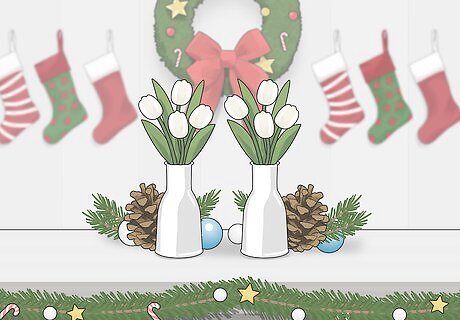 Add vases of white flowers to your evergreens for a floral take on "White Christmas." This is a great way to get that "White Christmas" look without snow. Simply tuck vases of fresh or silk flowers in among your evergreens, including placing a vase on the mantel and one as a centerpiece on your table. Try white tulips or white poinsettias. Add other touches of white, too, such as twirls of white ribbon and white candles.