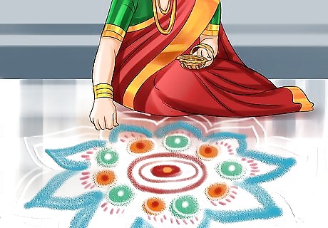 Create a rangoli on the floor or in a water-filled vessel. You can create a rangoli, which is a pattern made out of flower petals, dry rice, and colored flour or sand often made on the floor for decoration and good luck. They are often in simple geometric shapes, or in the shape of a flower or petal, and as large as you would like them to be. The base material is usually dry or wet powdered rice or dry flour, to which you can add vermillion, turmeric and other natural colors to create a multi-colored pattern. You can add flower petals on top and around the flour to accentuate the multi-colored pattern and add an eye-catching element. You can also add tea lights, or small candles, around the pattern. If you wish to avoid fire risks, you can buy battery-operated tea lights. If you don’t have space or just prefer not to place the rangoli on the floor, you can fill a bowl--ideally a semi-shallow, wide and flat bowl--with water and place flower petals inside to create a floating pattern. You can place this on the mandap or any other surfaces in the room.