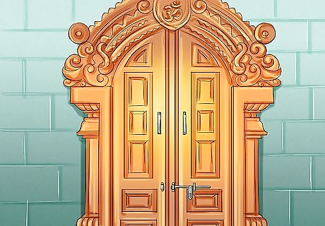 Select or design a distinctive door. The door of the pooja room must be distinguishable from the other doors in the house. You can choose a wooden door, with perhaps religious carvings in the wood, or perhaps a glass, clear door that displays the room even when closed. If you want to add or change the door to your room, you can browse available designs at your neighborhood hardware and construction store, and then read our tips on how to fit and install the doors in your home.
