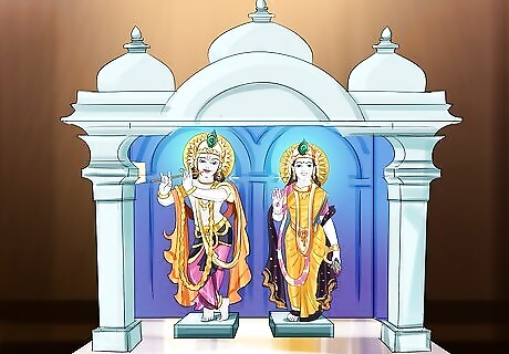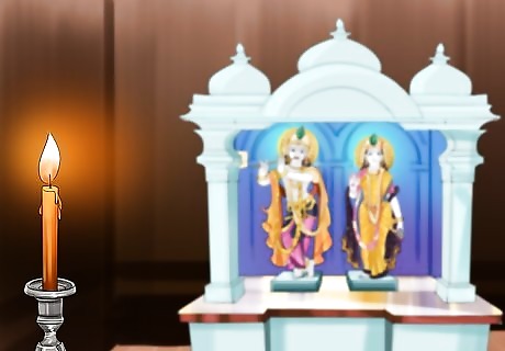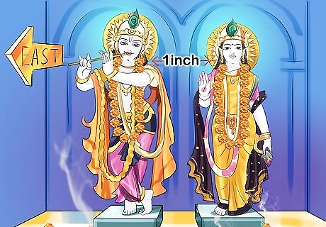 Place the idols appropriate distances apart. Careful and respectful placement of your religious figures and images are an important aspect of creating the right energy and presentation in your pooja room. Idols should be at least one inch apart from each other, and should not face each other. Idols--and the rest of your pooja room--should never face south. Keep the idols in the east and/or west of the prayer room, a few inches from the wall, and make sure they’re always in perfect condition, clean and well cared-for.