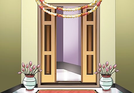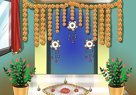 Place flowers and plants in vases and on the mandap. Decorating the room with natural plants and flowers enhances the soulful look and feel of the room and will contribute to the positive, natural energy it is supposed to produce. You can hang flower garlands above or around door and window frames, or across the mandap, and you can also place loose bunches of flowers, or petals, across the mandap to enhance the beauty of that sacred spot.