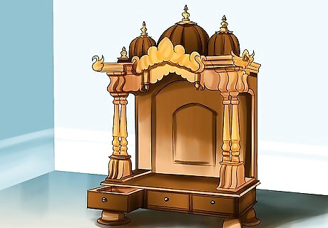 Buy or build the altar. An easy way to create a new mandap, or altar, is to repurpose a wooden bureau or cabinet. The best kind to use will be one that has an open area, or shelves, on the top half, and drawers on the bottom half. Every mandap must have space to feature the religious figures and imagery. If you have the money in your budget, you can order custom-made mandaps and choose your preferred color and materials. Wood or marble are popular choices, depending on the style of your room. You can refurbish old cabinets by fixing or removing drawers or cabinets by using a screwdriver or other basic home tools. You can also use sandpaper to smooth the cabinet, and paint it with wood stain or a new coat of paint (in white, light yellow, orange, or blue!) Having drawers on your altar is useful for having a space to keep incense, lighters, turmeric, thali plates and other small items used during worship in the pooja room. The open space and shelves will house idols and images.