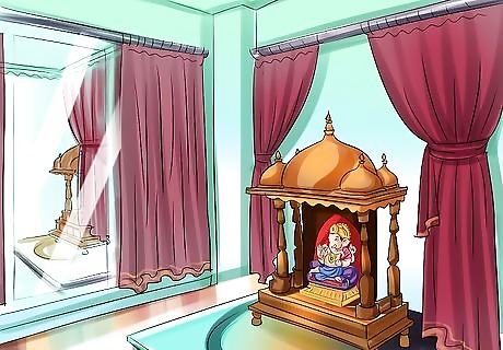 Add mirrors to create the illusion of more space. You can “open up” your pooja room by adding a mirror. You can find a mirror with a detailed, bronze frame and hang it or lean it against the wall, both of which help the room feel a little bit bigger than it is. If you have a window, placing a mirror on the opposite wall will help enhance the natural light that comes in.