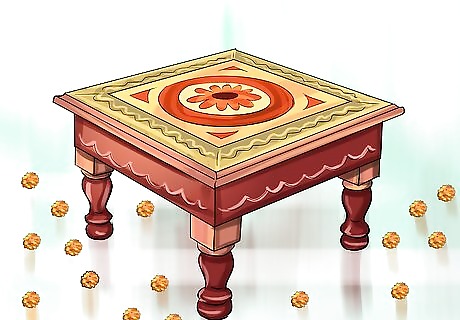 Add cushions or stools for sitting and kneeling. While praying or meditating in your pooja room, you will want to sit or kneel comfortably. You can add a low, wooden stool with a cushion on top, or you can add several round or square cushions that will be comfortable to sit on. You can buy these at any department, general merchandise or furniture stores.