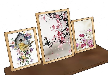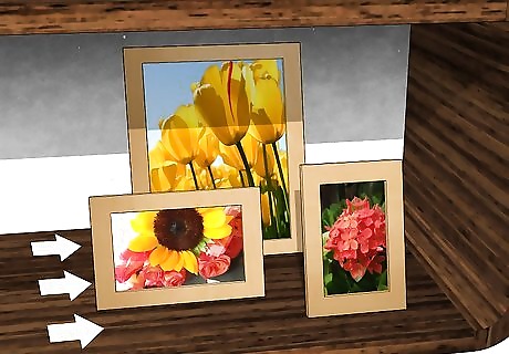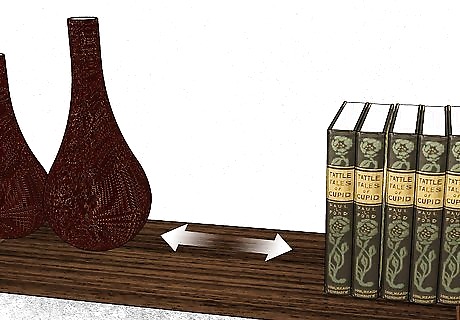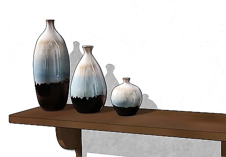 Make use of the depth by arranging some objects further back on the shelf. If you pull everything to the end of a shelf, the final result will be very flat. If you have a deep enough shelf, try placing some items closer to the wall, and others toward the front of the shelf. That way, your eye will immediately be able to see the depth, and the shelf will look more visually interesting. For instance, you can lean artwork, large books, or even painted, empty picture frames at the back of the shelf. Then, you can place smaller statues, framed pictures, or other decorative items near the edge of the shelf. Make sure you’re not putting items too close to the front of the shelf since it will look unbalanced and could be a falling hazard.
