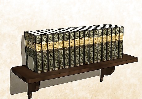 Group small stacks of books together. If you’re decorating a whole bookshelf, of course, you can include as many books as you can fit. However, if you’re only decorating a single shelf, you might want to be more selective about the books you choose. You could pick books that you love to read over and over, or if you prefer, you could opt to display books with bindings that match your décor. For an elegant display, include a collection of leather-bound volumes. Don’t be afraid to get creative with your arrangement! You can display some books with the front facing outward, especially if they have interesting cover art. You can also stack some books horizontally and some vertically. Take dust covers off of hardcover books to make them look less busy. Buy old books from a thrift store that you don’t want to read to use just as decoration.