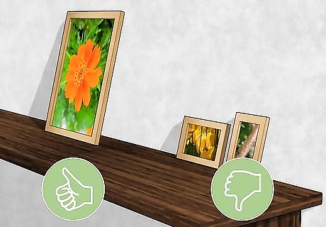 Balance the scale of the objects you’re using. The size of your shelf should dictate the height and width of the decorations you include. For instance, a large mantle might be the perfect place for a huge framed portrait, but that same picture would look out of place above a short floating shelf. Similarly, the pieces should balance with each other. If you’re using a few larger pieces, a very tiny, delicate figurine would be lost in the design, for example. Tip: The best way to determine whether something works with the scale is to look at the shelf from the opposite side of the room. If something overwhelms the other objects on the shelf, or if a smaller item gets lost, it might need to be moved.