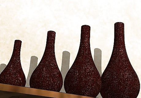 Group objects in odd numbers. For some reason, odd-numbered groups of objects are typically more pleasing to the eye than even-numbered collections. While groups of 3 are probably the most common, you can gather 5 or 7 smaller objects together on your shelf as well. These don’t have to be groups of the same object. For instance, you could lean a large art book against the wall, then place a heavy marble paperweight and a bowl full of pretty river rocks in front of the book to make a nice tableau.