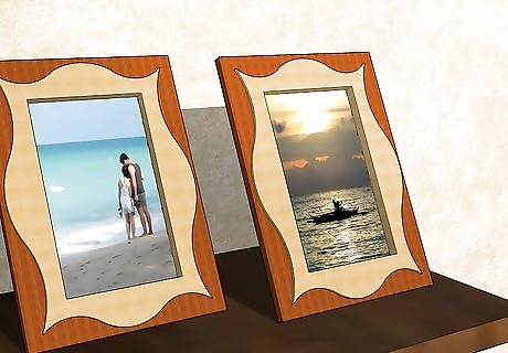 Make the shelf feel more personal with framed art or pictures. A framed picture is a great way to add your personality and design style to a shelf. You can either lean the art against the wall and anchor it by placing small, heavy objects in front of it, or you can hang it just above the shelf for more security. Photos of your family and loved ones will add a lot of warmth to your living room. You could also opt for art that reflects your design style, like pop art if you love bright, bold colors, or a simple line drawing if you prefer a more understated look. You could even create a gallery wall by hanging a variety of pictures above the shelf. Then, decorate the shelf with small objects that mimic the colors or shapes in the pictures. Lean a large frame against the wall and later smaller ones in front to create a relaxed style.