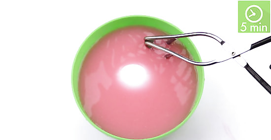 Soak the egg for 5 minutes. Place the egg on a spoon and dunk the egg into the liquid. Turn the egg around so that both sides get color. Allow the egg to soak for five minutes. Leave the egg longer if you’d like a darker color.