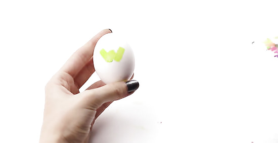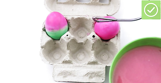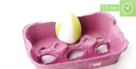 Dye the egg in multiple colors. You can dye the egg at least two colors by dipping only one section of the egg in at a time. This works best if you start with a fresh, boiled egg that has not been dyed yet. Hold one-half of the egg so that only half of it is submerged in the dye. After about five minutes, submerge the other half of the egg in another color. You will probably have to hold the egg as it soaks to submerge only half of it.