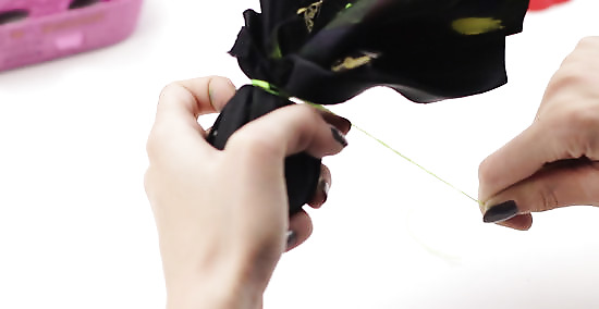 Secure with a tie. Use a twisty tie to secure the fabric at the top of the egg. A string works, too, but a twisty tie is much easier to work with. Secure on the long side of the egg if you want the opposite end of the egg to show the pattern the best. Tie the egg horizontally if you want the wide side of the egg to show the design.