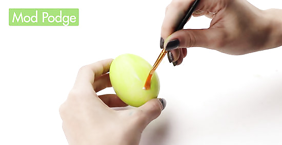 Apply Mod Podge. Use a separate sponge brush to apply a thick coat of mod podge to the egg. Make sure all of the egg gets covered with the Mod Podge. This part will be messy, and your fingers will likely get covered with glue. You can use baby wipes to get the glue off of your fingers.