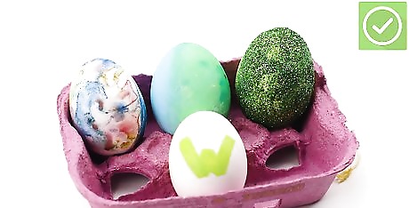 Allow the eggs to dry. Wait ten or fifteen minutes for the eggs to dry. Handle them carefully when you move them. Display your Easter eggs as you wish.