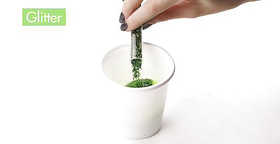 Pour glitter over the egg. Put the egg into a plastic cup. The narrowest part of the egg should be facing upward. Pour glitter over the egg. Gently shake the cup so that the glitter covers the egg. You can add more glitter if necessary.
