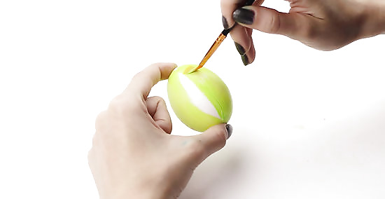 Paint one half of the egg at a time. You can paint any design you want. You can leave it one color, paint geometrical patterns and shapes, or turn the egg into a cute animal—like a bird. Let it dry before painting the other half to avoid smearing the paint.