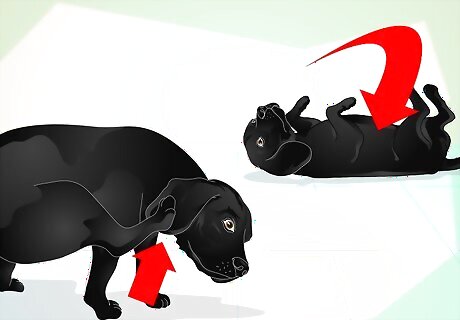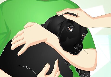 Hold the dog steady. Have your helper place one arm under the dog’s head so its neck rests on the helpers elbow bend. Have the helper put his or her other hand around the dog’s body, holding it steady. If a helper isn’t available have the dog lay down. You will need to hold it steady while applying the medication. Place one arm gently across the neck and under the chin of the dog, and use the hand of that arm to hold the lower front leg. Place the other elbow on top of the dog, pinning its upper front leg to its body.