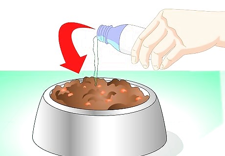 Put the medicine in your cat's food. Liquid medication and occasionally pills can be mixed with a flavorful canned food and eaten by the cat when it normally eats. Be sure to mix the medication in thoroughly, so that the cat cannot, or has a hard time, avoiding it. Some cats, for example, can detect pills in their food and eat around them. If you are trying to feed your cat pills in its food, be sure to inspect the bowl afterword for leftover pills. Check the directions for medication in pill form to see if you can crush it up. Your cat is more likely to eat a crushed up pill mixed into its food than a whole pill mixed into the food.