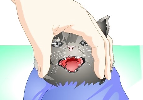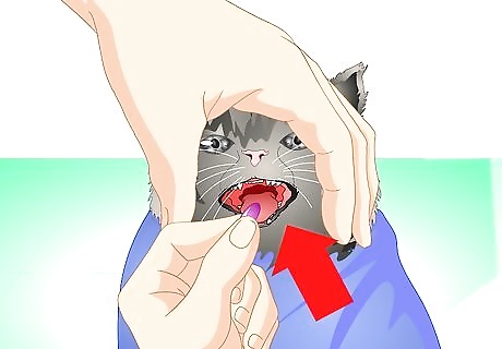 Open the cat's mouth. Put your thumb on one side of the cat's mouth and your forefinger on the other side of the mouth. Apply pressure gently by pressing down on the cat’s lower jaw until your cat opens its mouth.