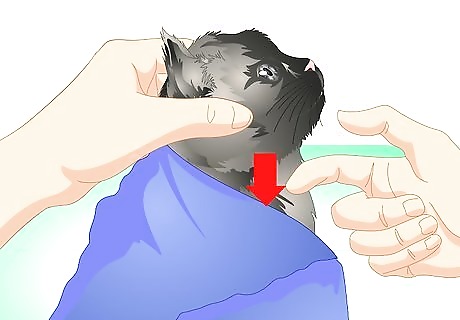 Wrap the cat in a towel to immobilize it. This will only leave the cat's head exposed. Thick bath-sized towels can be used to keep a cat tightly bound so its paws cannot claw at you. This is one of the best options, as it keeps you and the cat safe. Start by placing the towel, unfolded, on a table or countertop. Put the cat in the center of the towel. Pull the towel up over the cat’s rear end and then fold in the sides, essentially wrapping the kitty up like a burrito. Make sure the sides are pulled up snug to keep the cat from being able to pull its legs out of the towel. Remember a cat can still use its teeth when in this position. Placing a hand behind the cat’s head can keep the head steady but you should also keep your hands away from its mouth.