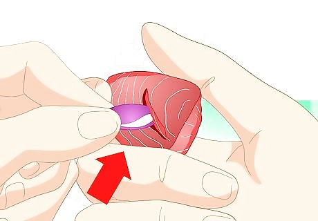 Bury the medication in a tasty treat. If your cat won't eat its medicine in its normal food, try enticing it with a special treat. Get a bit of tuna or other smelly morsel and put the pill in it. You can also use a piece of cheese, a bit of deli meat, or a bit of hotdog. Feed the treat directly to the cat, instead of letting it pick at it in a food dish. This way it is less likely to pick out the pill and avoid eating it. There are treats specifically designed so that you can hide a pill in them. These "pill pockets" have a hole inside where you can conceal the treat and they smell strongly, so your cat will be enticed by them. Make sure the cat has actually swallowed the pill. Feed the cat another piece of treat immediately after the one with the pill. This will make it more likely to quickly swallow the pill.