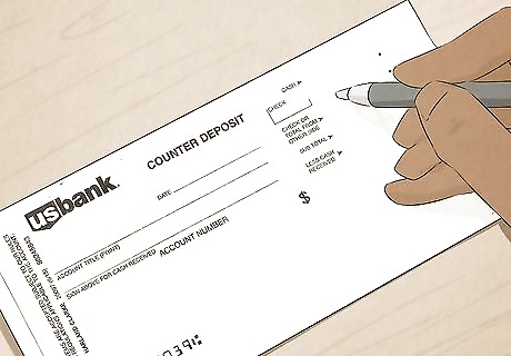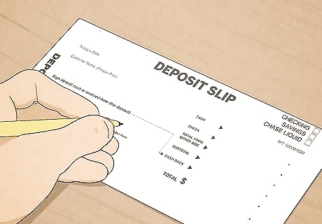 Fill out a deposit slip. There should be a stack of slips along with pens at a table. Deposit slips are about the same size as a check. You can also request a deposit slip from the teller, but the process will move more quickly if you fill out the deposit slip ahead of time. Write in your account number and the amount of the check on the deposit slip. There should also be space for requesting cash back.