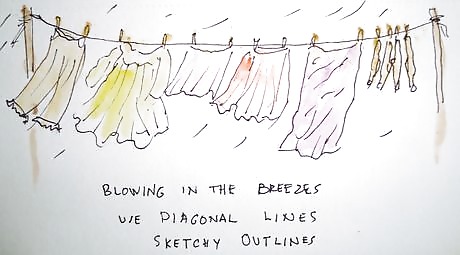 Hang out some quilts on the line. This will offer big spaces to fill with interesting shapes, prints and colors if you feel like painting detailed patterns and textures. Quilts on a wash line are a classic and standard watercolor theme, so give that idea some thought for your next painting.