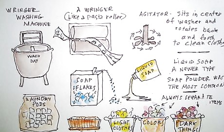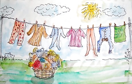 Think about the things needed to do laundry. For hanging clothes outside, your main item will be a container to hold and transport the clothes, such as a plastic or wicker basket. Clothes baskets come in many styles and colors, so you might include it full of laundry, on the ground. Clothes pins come in two styles. They are almost always made of wood and are standard or clip type.