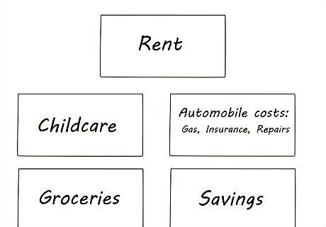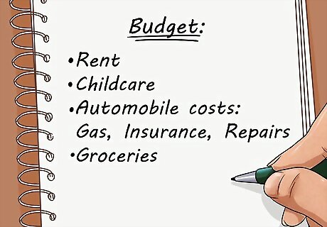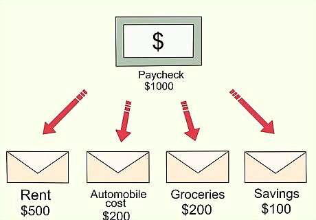 Create your budget. This means dividing your money into categories. Avoid "Miscellaneous" categories, as you should ideally know where your money is going.Some suggestions include: Rent or mortgage payment Childcare Automobile costs: Gas, Insurance, Repairs, etc. Groceries Club Fees (or some type of organization): Gym, Girl Scouts, Yoga Studio, etc. Utilities Taxes (if these are not taken out automatically or for some reason you need to pay back). Saving (which should be transferred into your bank account) Entertainment: Eating out, Concerts, Movies, Outings, etc.