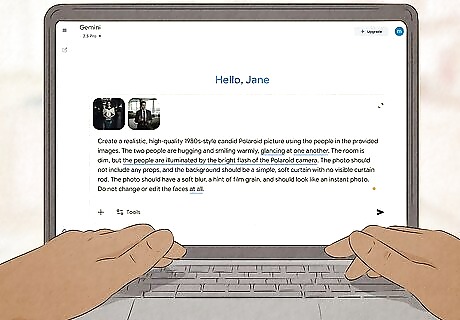 Type or paste the prompt. To get the best Polaroid picture, you'll want to be as specific as possible with your request. Here's an example prompt to create a Polaroid picture of any two people: Create a realistic, high-quality 1980s-style candid Polaroid picture using the people in the provided images. The two people are hugging and smiling warmly, glancing at one another. The room is dim, but the people are illuminated by the bright flash of the Polaroid camera. The photo should not include any props, and the background should be a simple, soft curtain with no visible curtain rod. The photo should have a soft blur, a hint of film grain, and should look like an instant photo. Do not change or edit the faces at all. Jump down to Other Polaroid Prompt Ideas for more example prompts!