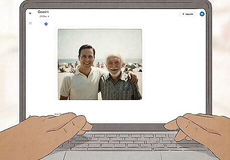 Upload the two pictures you want to combine. Most people do the trend using a picture of their current self hugging their younger self, a celebrity, or a loved one, but you can hop on this trend with any two images that spark nostalgia. For best results, use pictures that clearly show both subjects' upper bodies and faces. To upload: Click or tap the +. On a phone or tablet, tap the Gallery icon. On a computer, click Upload Files. Select the photos you want to combine. Need prompt ideas for your AI polaroid picture? Jump down to Other Polaroid Prompt Ideas.