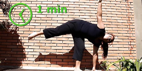 Hold the pose for up to a minute. Do not hold the pose longer than is comfortable for you. You may only be able to hold it for 30 seconds. If you feel any strain or dizziness, you should come down from the pose. To exit the pose, exhale as you lower your left leg. Transition back into extended triangle pose. Make sure to exhale as you lift your torso when transitioning back into extended triangle.