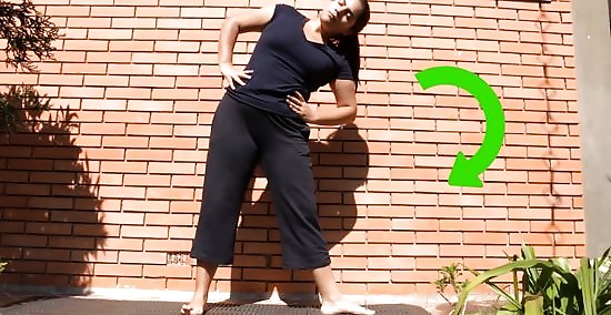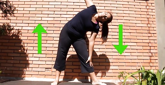 Extend your body to the right and then to the left. Start with the torso. Reach your right hand out as far as it can go to move your torso directly over your right leg. Engage your core to keep your body stable and balanced. You want to make sure you stay standing strong. You can anchor your movement by strengthening your left leg and pressing your heel into the floor. Now, open your torso to the left. Move your left hip forward slightly so both hips are square and in the same plane. Move your tailbone toward your back heel.