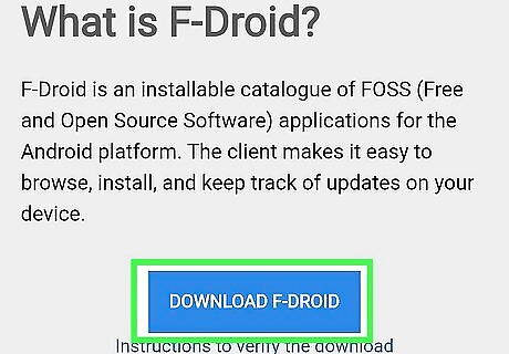 Download the alternative app store from its official website. For example, if you want to download F-Droid, go to the F-Droid official website. If you're using a Samsung phone or tablet, the Samsung Galaxy Store is most likely pre-installed, so you don't have to download it to use it. You'll first have to change some settings on your phone to allow downloads from sources other than the Play Store. To do this: Go to Settings. Tap Apps. Tap ⋮. Tap Special access. Tap Install unknown apps. Tap the source downloading the apps (since you're downloading an alternative, your web browser will be downloading an APK, so tap the toggle next to your browser, like Chrome, to enable it). If you're using a Samsung, you have another step to take before you can download apps outside the Google Play Store. This is all enabled for your protection, but here's how you can disable it: Go to Settings. Tap Security and privacy. Tap the toggle next to "Auto Blocker" to turn it off.