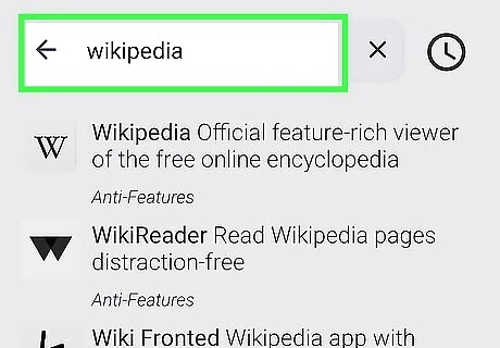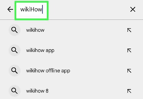 Type an app name into the search box and tap the magnifying glass on your keyboard. The search field is at the top of the screen, and the magnifying glass is on your keyboard. For example, you can type wikihow to search for the wikiHow app, or photos to browse various photo apps. If you’re just browsing, skip this step.