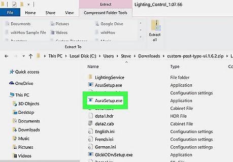 Open the installer. Once Asus Aura has been installed onto your computer, open the installer and follow the on-screen instructions to set up Asus Aura. During installation, you can choose the type of lighting you want Aura to display. Lighting options include: Static, Breathing, Strobing, and Color Cycle.