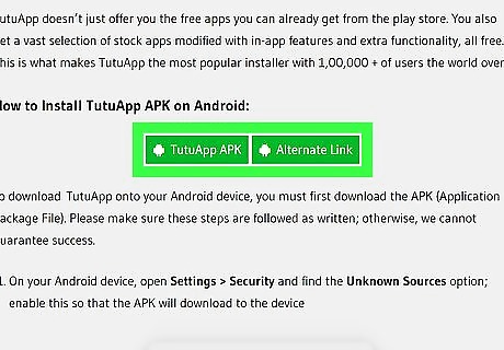 Download the Android TutuApp APK. You’ll need this to download anything in the Google Play Store for free. Click either of the green boxes to start the download.