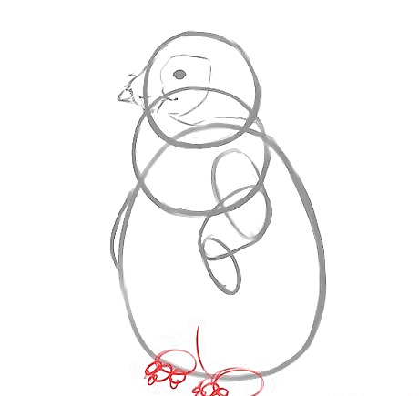 Draw circles for the feet. Give your penguin three stubby toes on each foot with an arc coming up to show where the foot begins.
