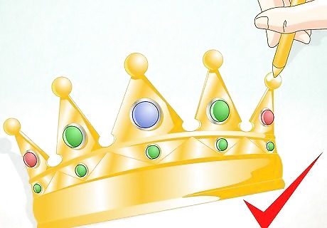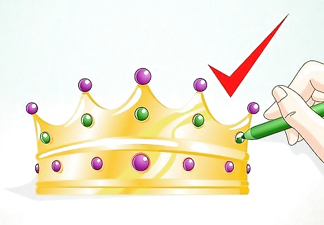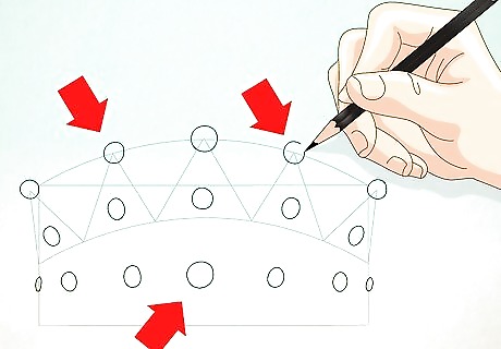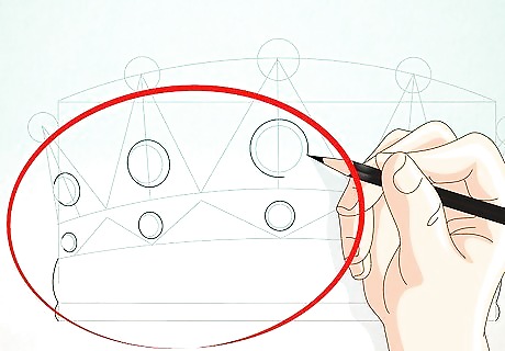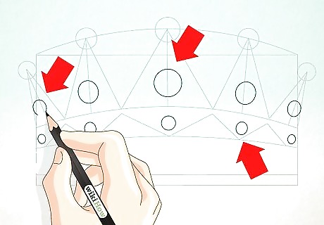 Draw circles at the center of the zig-zag shapes at the upper part of the crown. Draw smaller circles at the middle of the zig-zags at the middle of the crown.