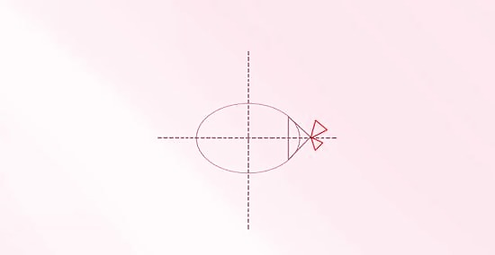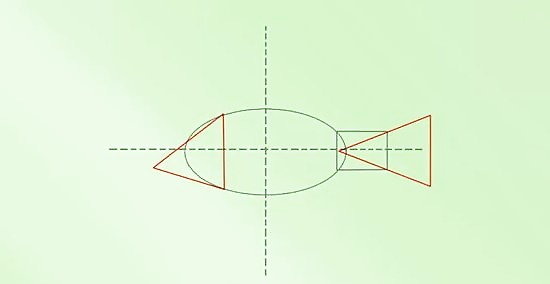 Draw a cross guideline to help align the shapes. Draw an oval and a triangle guideline for the fish’s body.