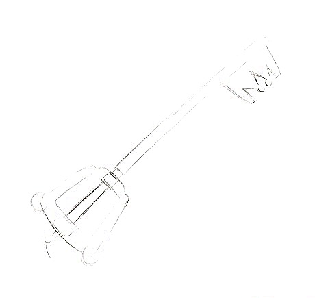 Draw the handle first, because it is the easiest. If you are making a Keyblade up, the handle can be any shape, but it looks the best if it is an oval with a line in the middle. Draw an oval, a line going through the middle, then another oval (slightly larger) outside of the first one. When you color it in, you can add cool designs to the handle.