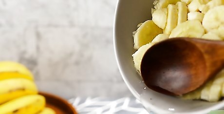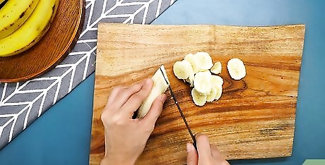 Peel and slice your bananas into thin, 0.25 in (0.64 cm) chips. Set aside several bananas that you’d like to dry and store on a long-term basis. Peel each piece of fruit and use a knife to cut the bananas into thin, 0.25 in (0.64 cm) slices. If you’d like to reuse or dry your banana peels, set them aside for later.