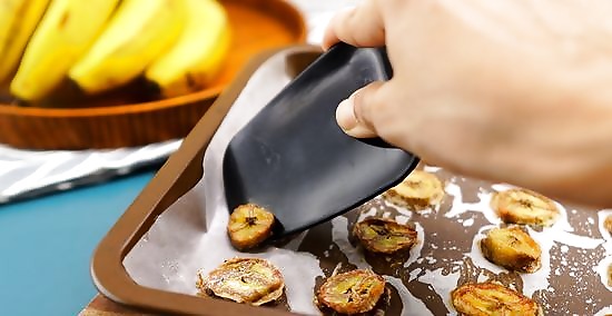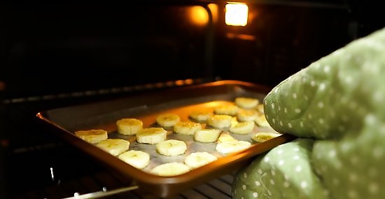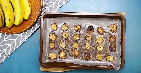Examine the surface of the bananas to see if they’re crisp or moist. Lightly tap the fruit to see if you notice any moisture in the chips. If so, place the trays back in the oven for a couple more hours. If the chips are completely dry, then they’re ready to be stored!