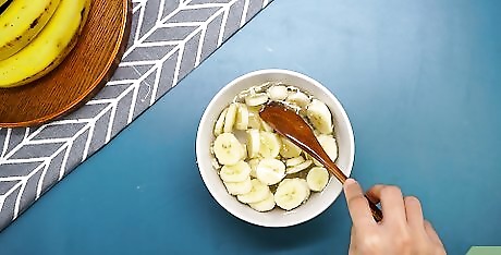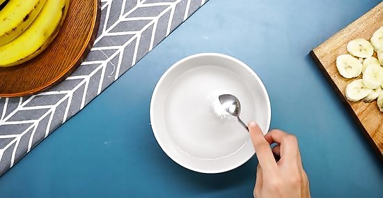 Soak the banana slices for 3-5 minutes. Drop your banana slices into the bowl and let them sit for several minutes. At this point, drain the bowl and place them on a flat surface.